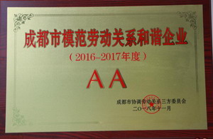 经成都市人民政府和成都市协调劳动关系三方委员会评选审定,我公司获评“成都市模范和谐劳动关系-先进集体”和“成都市模范劳动关系和谐企业-AA级”。