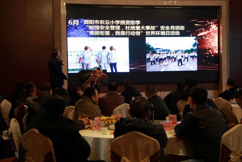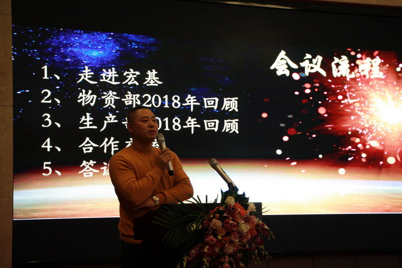 ▲公司董事长兼总裁吴逸云先生讲话▲会议首先以“走进宏基”为主题,通过“2018宏基大事记”的形式,向合作伙伴介绍了2018年宏基公司重点工作和取得的部份成绩,物资管理部和生产管理部负责人也向合作伙伴介绍了相应系统的运行情况,籍此向合作伙伴更深入全面地展示宏基,同时传递宏基的价值观和企业文化。