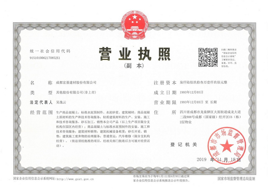 成都宏基建材股份有限公司于2019年11月18日在成都市市场监督管理局完成工商变更登记。原注册地“成都市青羊区王家塘巷8号”变更为“四川省成都市龙泉驿区大面街道成龙大道二段888号成都(国家级)经开区 C6(栋)2层物业”。至此,我司顺利落户成都市龙泉驿区。