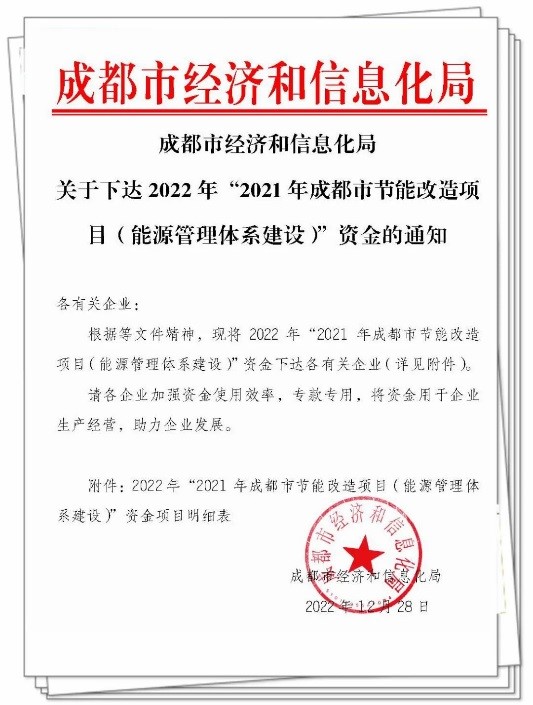 近日,我司荣获“2021年成都市节能改造项目(能源管理体系建设)”资金奖励。这标志着公司能源管理体系的有效运行和行业领先的体系建设迈上新台阶。